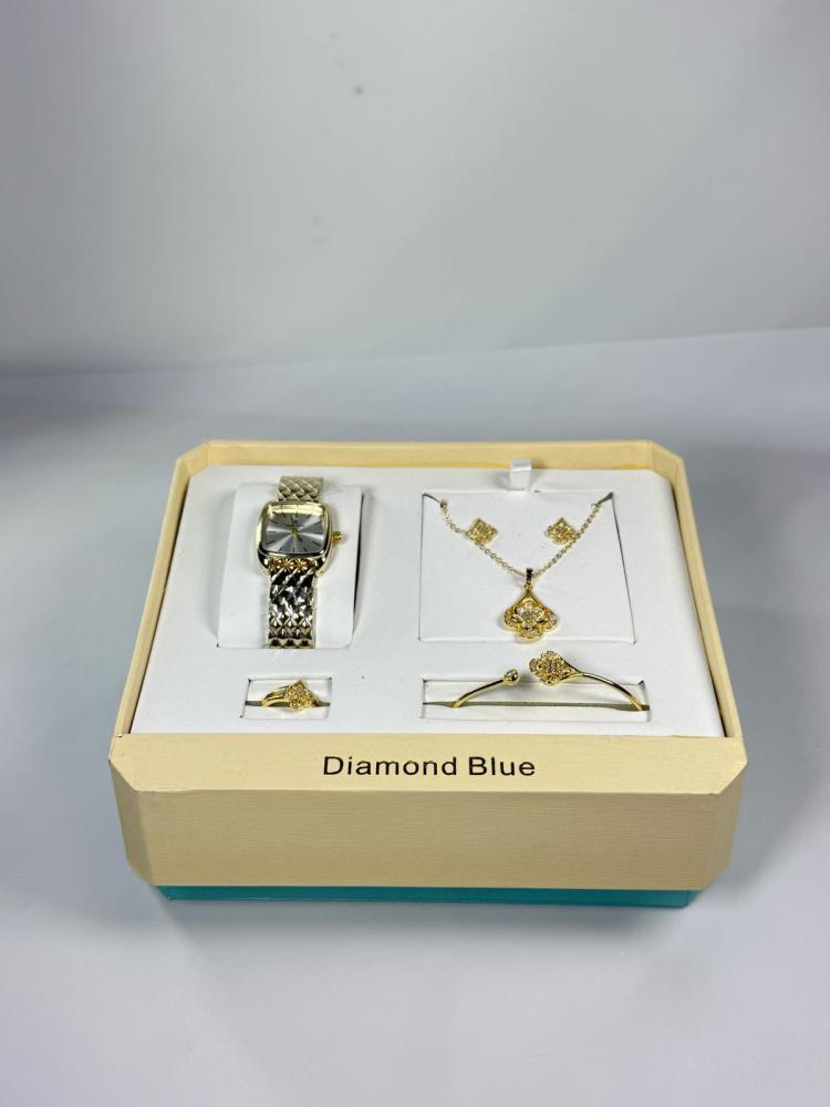 طقم ملكي متكامل من Diamond Blue يتكوّن من ساعة فاخرة بتصميم مزدوج اللون (فضي × ذهبي)، مع قلادة أنيقة، حلق، سوار، وخاتم بنفس النقشة الفخمة على شكل ورقة ألماسية مرصعة. مثالي للإهداء أو للمناسبات الراقية، ويأتي مغلفًا في علبة هدايا فاخرة.