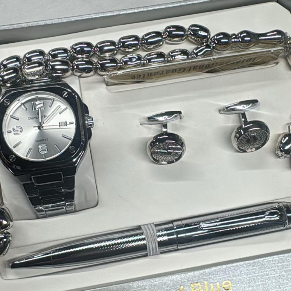طقم رجالي أنيق من Diamond Blue باللون الفضي بالكامل، يتكوّن من ساعة راقية بوجه فضي، سبحة معدني لامع، زوج من أزرار الأكمام (كبك) بتصميم دائري أنيق، وقلم معدني متناسق. الطقم مثالي للهدايا الرسمية والمناسبات الخاصة ويأتي في علبة هدايا فاخرة باللون الفضي.