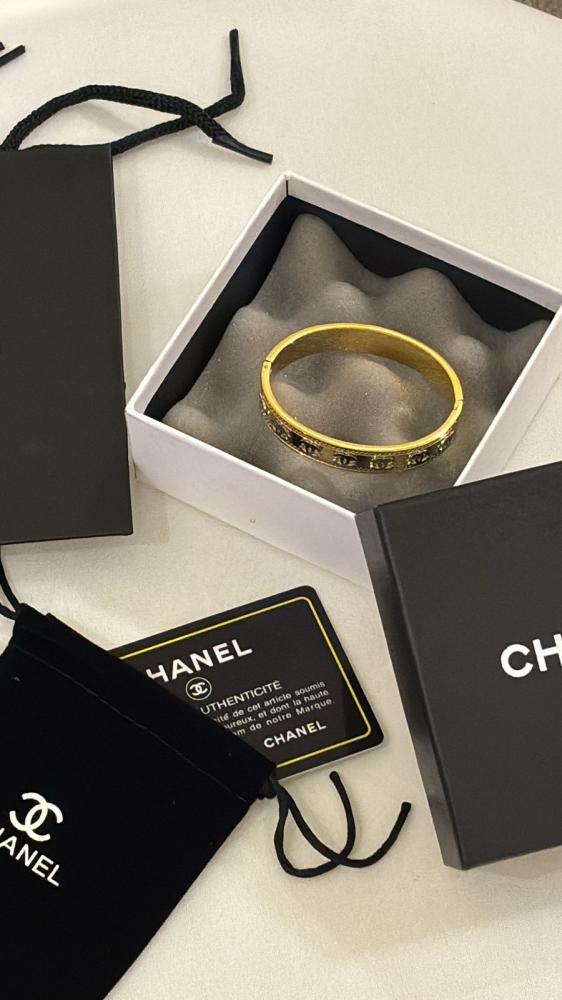 سوار ذهبي فاخر من Chanel مزين بأيقونات الدار الشهيرة بتفاصيل دقيقة ولمسة لامعة، يجمع بين الجرأة والأناقة في قطعة واحدة تخطف الأنظار.